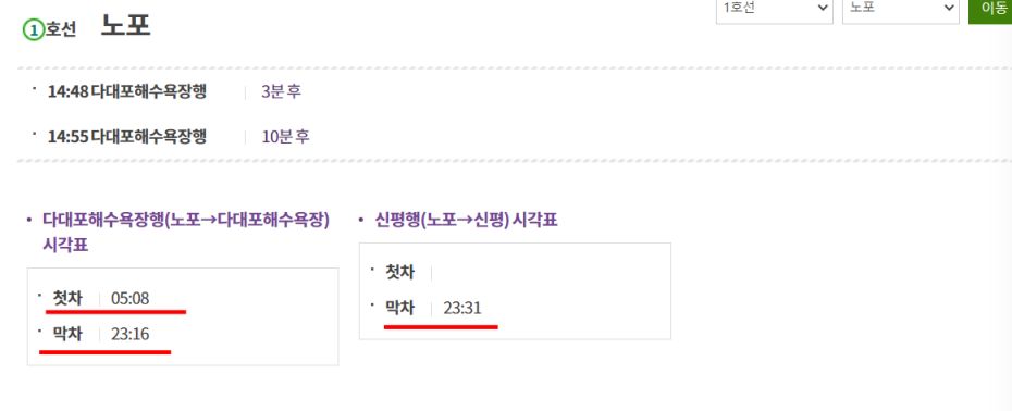 노포역의 시간표를 선택하니 다대포해수욕장 행의 열차가 몇 분 뒤에 오는지 실시간 확인이 가능합니다. 또한 해당 구간의 첫차와 막차 시간 그리고 신평행에 대한 막차 시간까지 볼 수 있으니 직접 확인해 보시기 바랍니다.