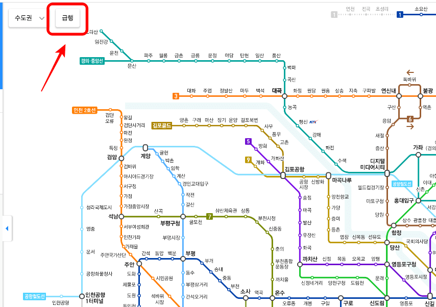 또한 빠른 이동을 위한 급행 노선도만 알아보시려면 지도 좌측 상단의 ‘급행’ 메뉴를 클릭합니다. 이후 지도를 확인하시면 1호선, 4호선, 9호선, 경춘, 경의중앙, 공항의 급행구간만 지도에 보이게 됩니다.