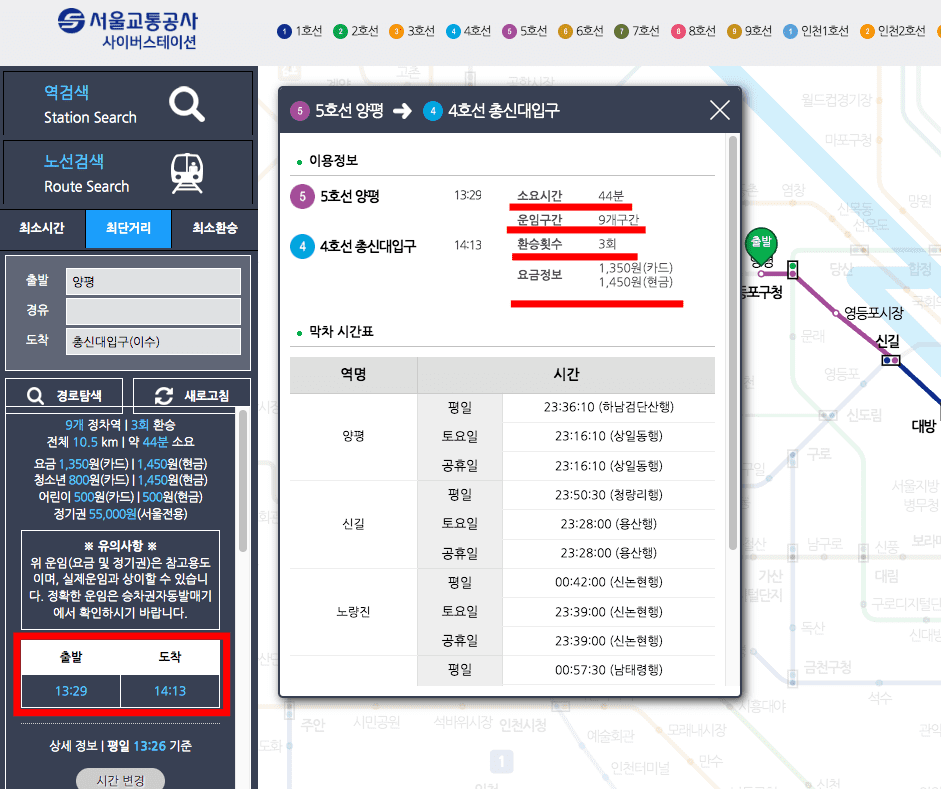 또한 좌측의 최단거리 검색을 이용하시면 출발과 도착 역 지정을 통해 소요시간, 운임구간, 환승 횟수, 요금정보까지 자세한 정보를 얻을 수 있으니 참고하시기 바랍니다.