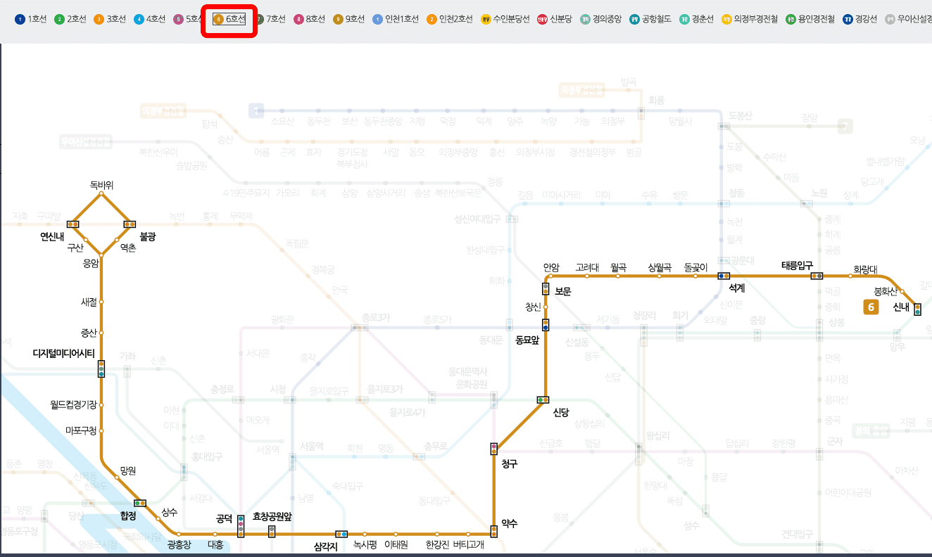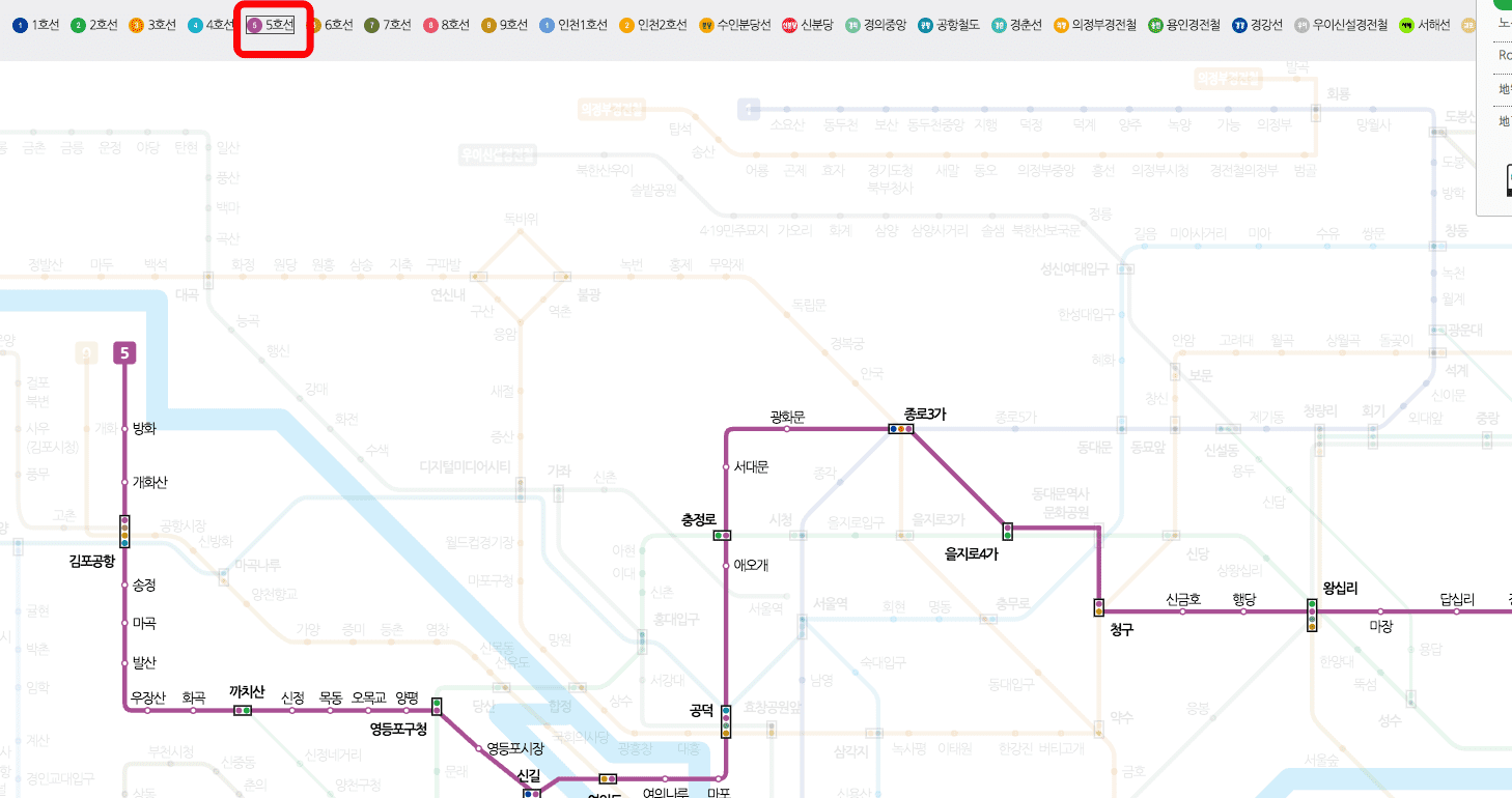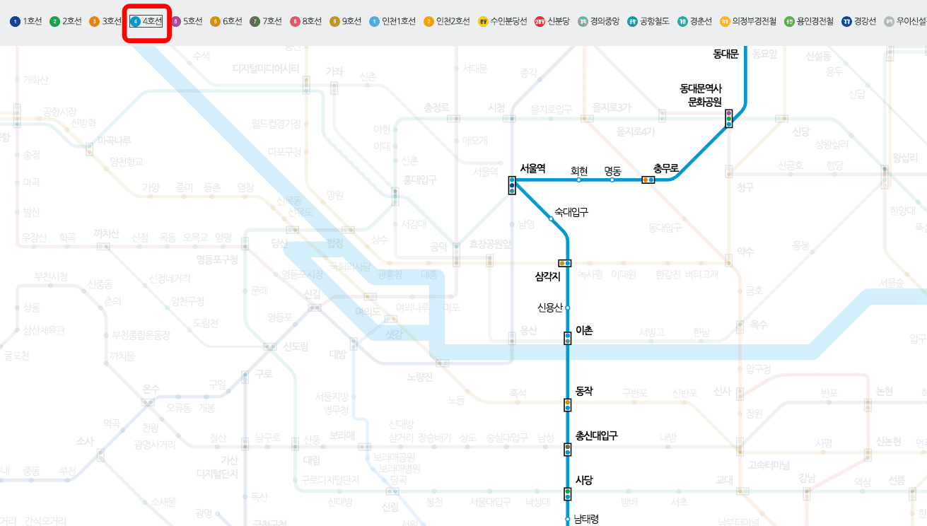 서울교통공사 서비스도 마찬가지로 각 노선을 선택해서 확인할 수 있는 기능을 제공합니다. 지도 상단의 노선을 선택합니다. 4호선, 5호선, 6호선을 확인해 보겠습니다.