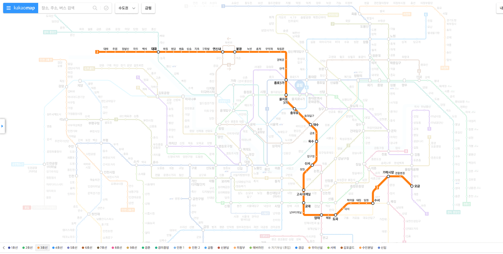 카카오맵 지하철 노선도를 이용하시면 총 9가지의 노선도를 1 노선씩 별도로 확인할 수 있습니다. 지도 하단의 노선을 선택합니다. 1호선, 2호선, 3호선을 각각 선택해 보겠습니다.