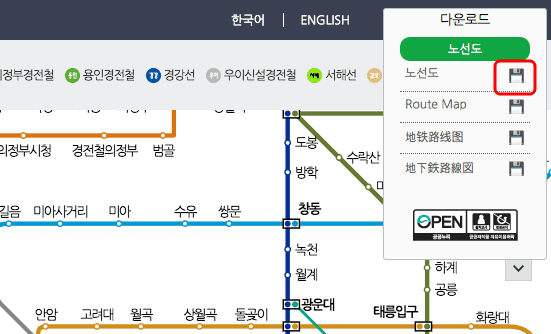 서울교통공사 페이지에 도착하시면 위와 같은 화면을 볼 수 있습니다. 우측 상단의 다운로드 메뉴를 클릭합니다. 세부 메뉴에서 노선도 우측의 디스크 아이콘을 클릭하면 PDF 이미지를 다운로드할 수 있습니다.