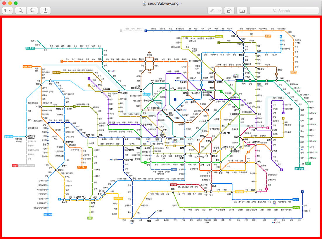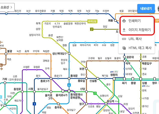 세부 메뉴에서 인쇄하기 또는 이미지 저장하기를 클릭합니다. 저장된 이미지를 확인하시면 seoulSubway.png 파일로 저장되어 있으며 파일을 열면 위의 사진처럼 서울 지하철 노선도 크게보기가 가능합니다.