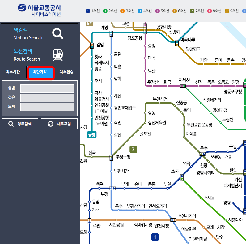 또한 좌측의 최단거리 검색을 이용하시면 출발과 도착 역 지정을 통해 소요시간, 운임구간, 환승 횟수, 요금정보까지 자세한 정보를 얻을 수 있으니 참고하시기 바랍니다.