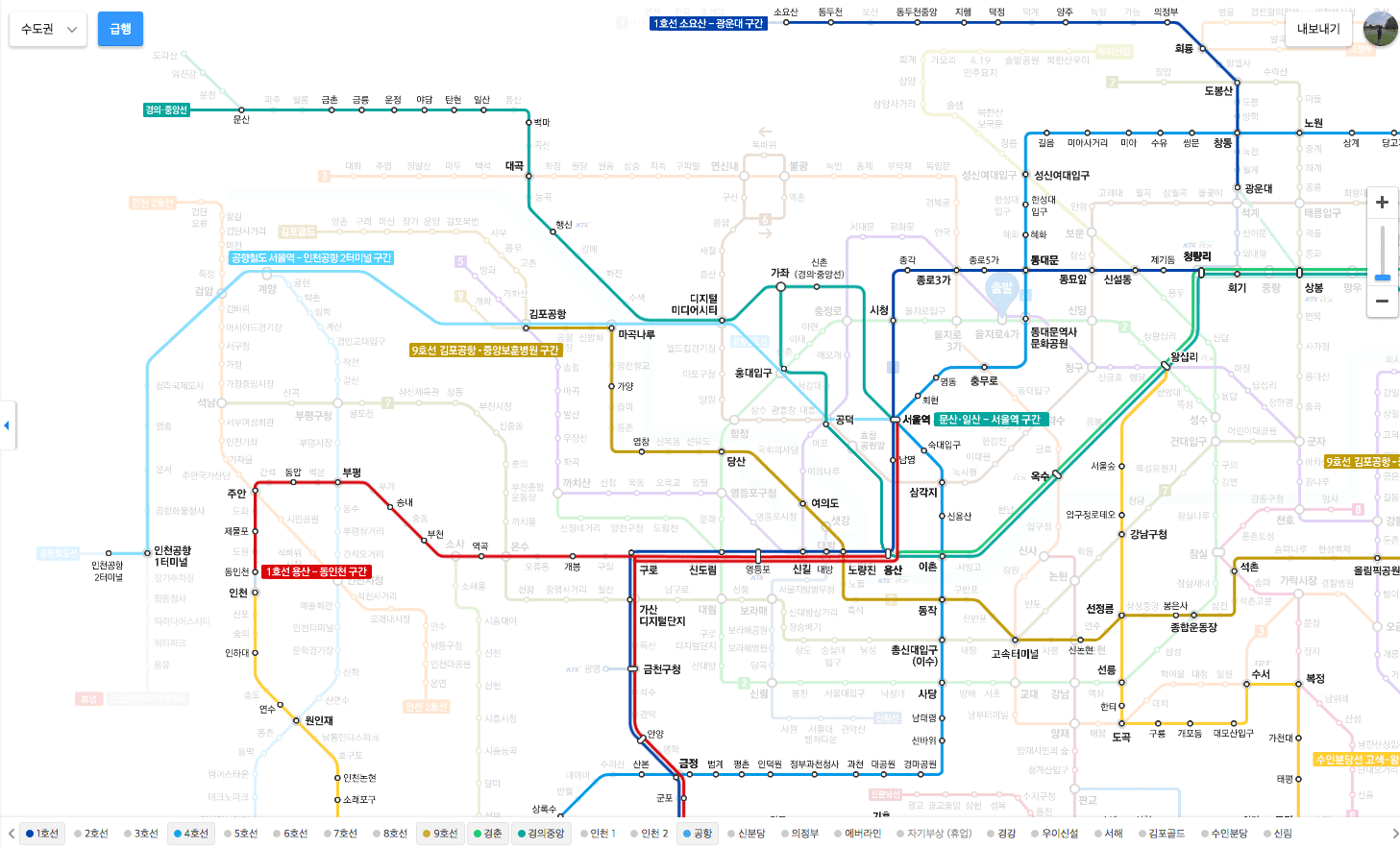 또한 빠른 이동을 위한 급행 노선도만 알아보시려면 지도 좌측 상단의 ‘급행’ 메뉴를 클릭합니다. 이후 지도를 확인하시면 1호선, 4호선, 9호선, 경춘, 경의중앙, 공항의 급행구간만 지도에 보이게 됩니다.
