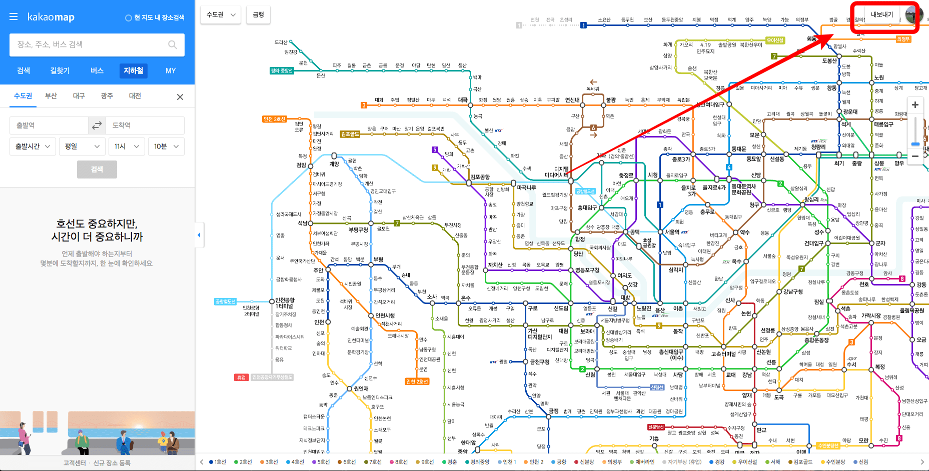 카카오맵 지하철 노선도 페이지에 방문하시면 위와 같은 노선도를 확인할 수 있습니다. 이 노선도를 이미지 파일로 저장하시려면 우측 상단의 ‘내보내기’ 버튼을 클릭합니다.