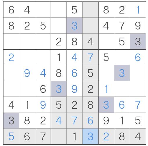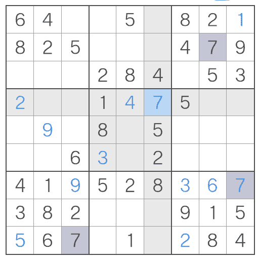 행과 열 그리고 사각형 안에 숫자가 들어갈 수 있는 유일한 위치를 찾아야 합니다. 예를 들어 행과 열, 사각형을 종합적으로 비교해 보았을 때 빈칸에 들어갈 유일한 숫자를 찾을 수 있습니다.