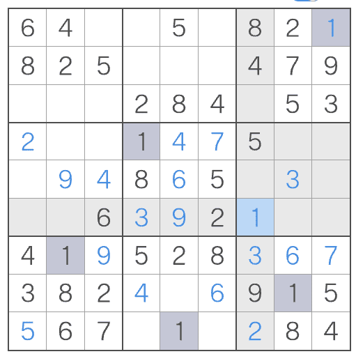 행과 열 그리고 사각형 안에 숫자가 들어갈 수 있는 유일한 위치를 찾아야 합니다. 예를 들어 행과 열, 사각형을 종합적으로 비교해 보았을 때 빈칸에 들어갈 유일한 숫자를 찾을 수 있습니다.