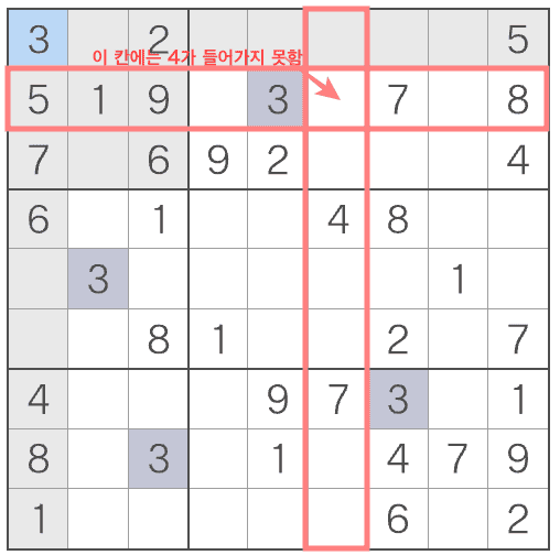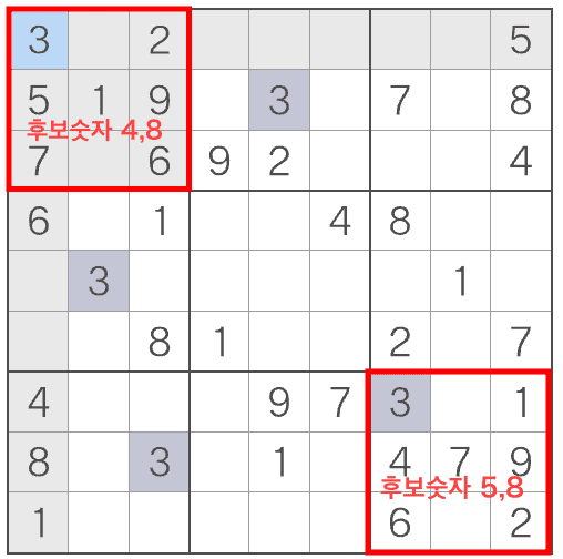 특정한 숫자가 3개의 칸 중에 2개의 칸에만 적용이 가능한 경우 다른 칸에서 후보 숫자를 제거할 수 있습니다.