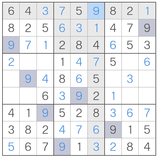 동일한 후보 숫자가 여러 개인 경우 직접 색칠을 통해 해당 숫자가 어디에 배치될 수 있는지 시각적으로 추적하는 방법입니다. 색칠하기를 하면 배치가능한 숫자를 더 쉽게 추론할 수 있습니다.