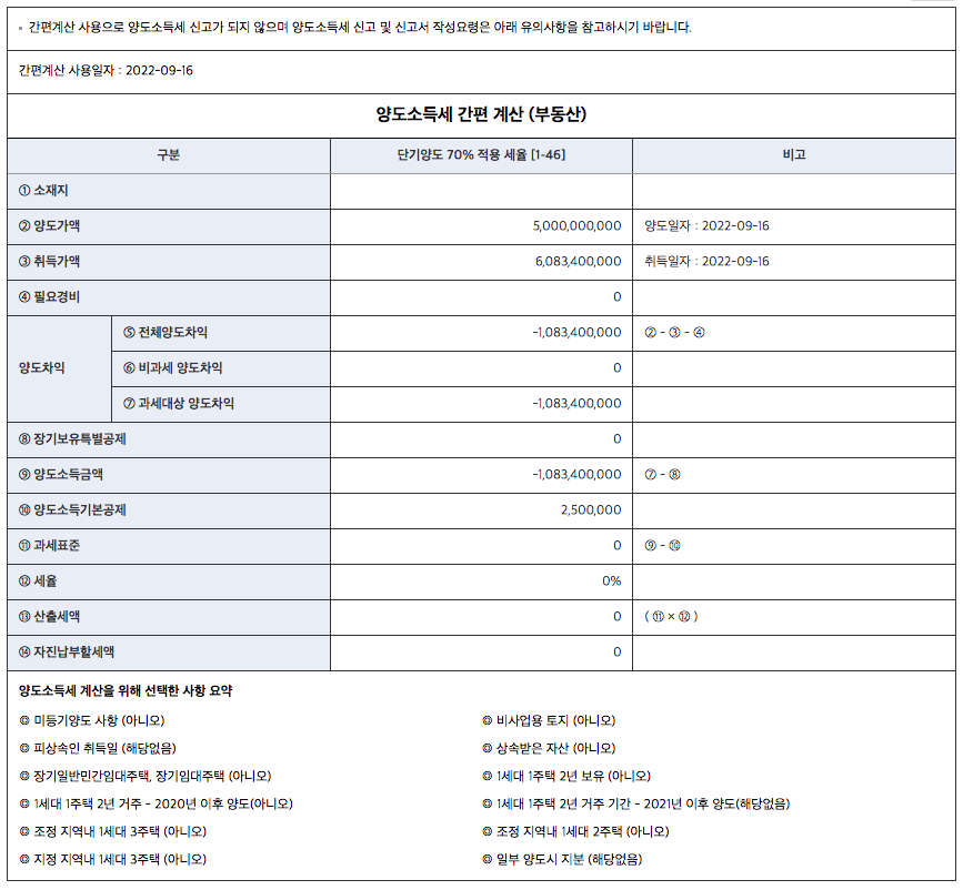 취득가액이 크면 양도소득세는 낮아지게 되는데요. 그렇기 때문에 거래금액에 매입가액, 취득세, 등록세, 법무사 비용, 취득 중개수수료, 기타 필요경비 등 입력할 수 있는 것을 전부 넣어 계산해보는 것이 좋습니다.