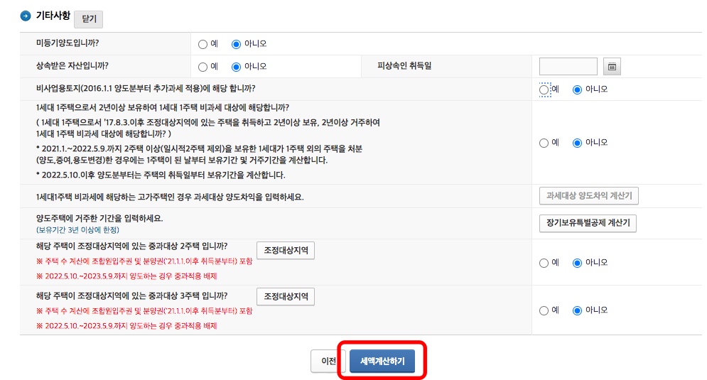 기타 사항에는 미등기 양도, 상속 지산, 비사업용 토지, 1세대 1 주택 비과세에 해당하면 과세대상 양도차익을 입력합니다. 마지막으로 세액 계산하기를 선택하면 양도소득세 자동계산이 완료됩니다.