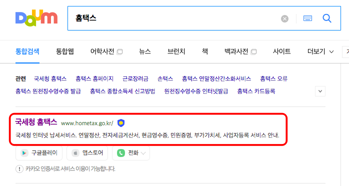 양도소득세 자동계산을 하려면 먼저 국세청 홈텍스 홈페이지에 방문해야 합니다. 여기에서는 다음 포털 검색을 통하여 아래의 사진처럼 바로가기로 이동해 보겠습니다.