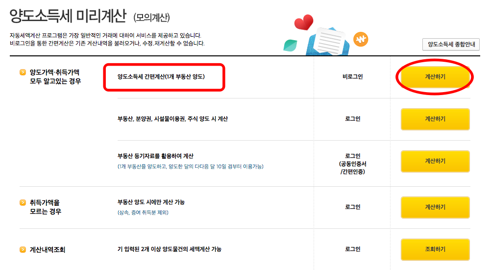 양도소득세 미리 계산 화면이 표시됩니다. 양도소득세 간편 계산 서비스는 로그인 하지 않아도 이용할 수 있습니다. 오른쪽에서 계산하기 버튼을 선택하면 바로 계산이 가능합니다.