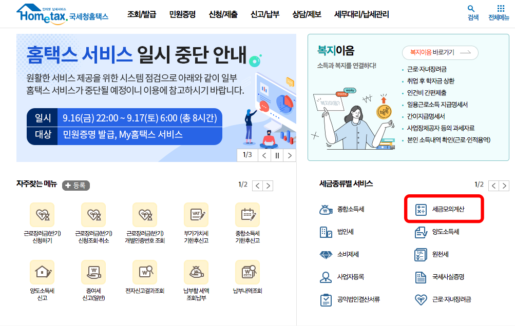 국세청 홈텍스 홈페이지에 방문하면 아래와 같은 화면에 보이게 됩니다. 세금 종류별 서비스에서 세금 모의계산을 선택합니다. 이외에도 종합소득세나 법인세, 원천세, 소비 제세 등에 대한 정보도 조회할 수 있으니 참고하시기 바랍니다.