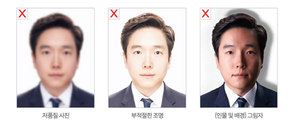 포토샵으로 수정한 사진은 사용할 수 없으며 배경은 균일한 흰색이어야 합니다. 테두리가 있으면 안되며 다른 사람이나 사물이 노출된 사진 또한 사용할 수 없습니다.