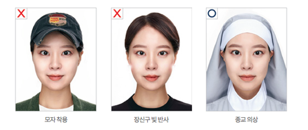 종교적인 의상을 착용하는 경우는 일상생활에서 항시 착용하는 경우에만 허용되며 얼굴전체가 나와야 합니다. 모자로 머리를 가리면 안되며 목을 덮는 스카프, 티셔츠 등을 사용하는 경우에는 얼굴 전체 윤곽을 가리지 않아야 합니다. 귀걸이등의 장신구를 사용하는 경우 빛이 반사되거나 얼굴 윤곽을 가리지 않아야 합니다.