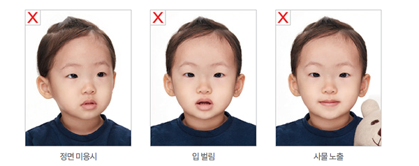 영아의 여권사진 사이즈와 규정도 모두 성인과 동일합니다. 영아의 경우 장난감이나 보호자가 노출되지 않도록 촬영해야 하며 입을 다물고 촬영하기 어려운 신생아인 경우 입을 벌려 치아가 조금 보이는 것은 허용됩니다.