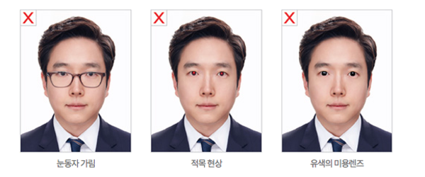 여권사진 촬영시 눈은 정면을 응시해야 합니다. 머리카락 안경테 등으로 눈을 가린 사진과 적목현상이 있는 사진은 사용할 수 없습니다. 유색의 컬러렌즈나 렌즈에 색이 들어간 안경, 선글라스 등은 사용할 수 없습니다. 눈동자와 안경렌즈에 빛이 반사되지 않아야 합니다.