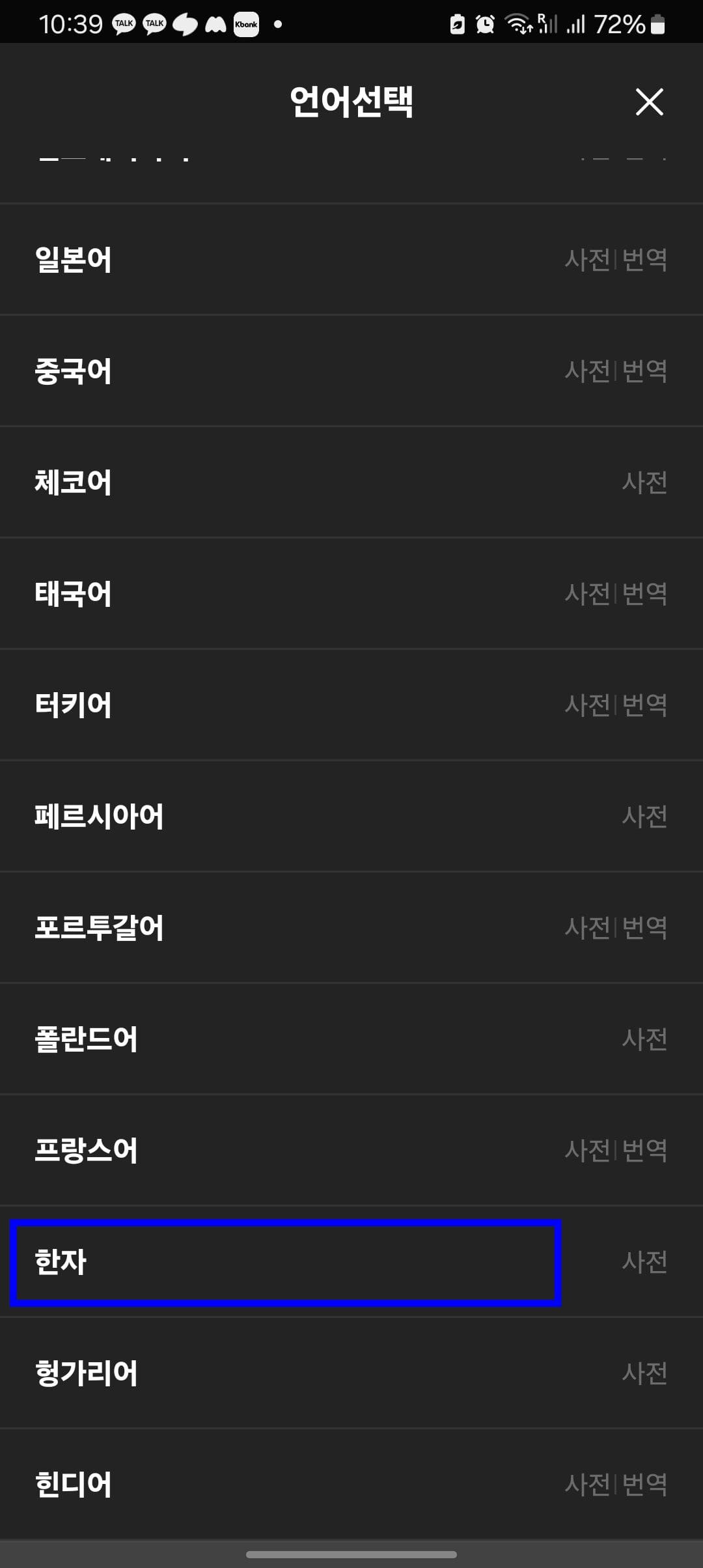 다음 한자 사전 앱을 실행하시면 처음에는 영어사전을 클릭하여 언어선택 화면이 표시되면 하단에서 한자를 선택합니다. 이번에도 증권이라는 단어를 검색해 보았습니다.