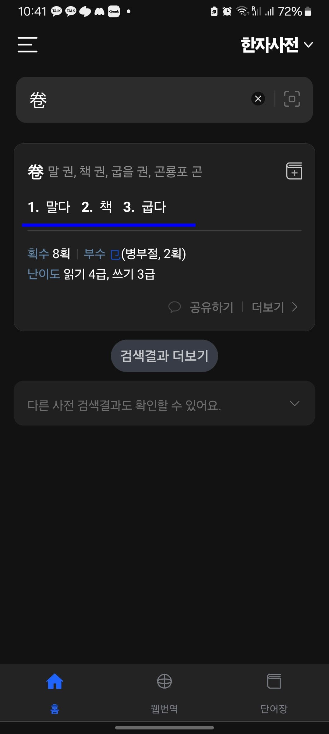제가 그린 한자가 잘 못 그려졌는지 말권이라는 다른 한자가 나오고 말았습니다.^^ 이렇게 새로운 한자를 알게 될 수도 있습니다.