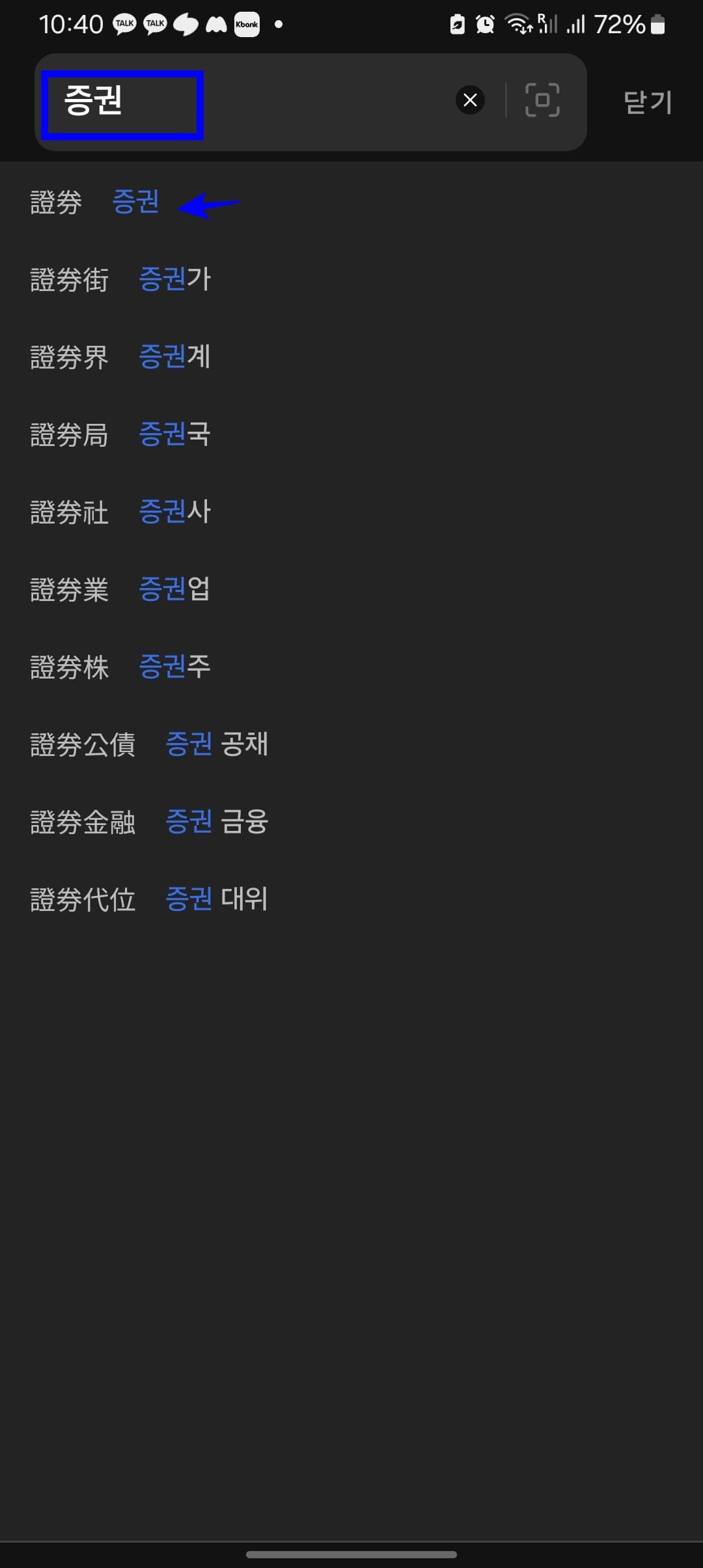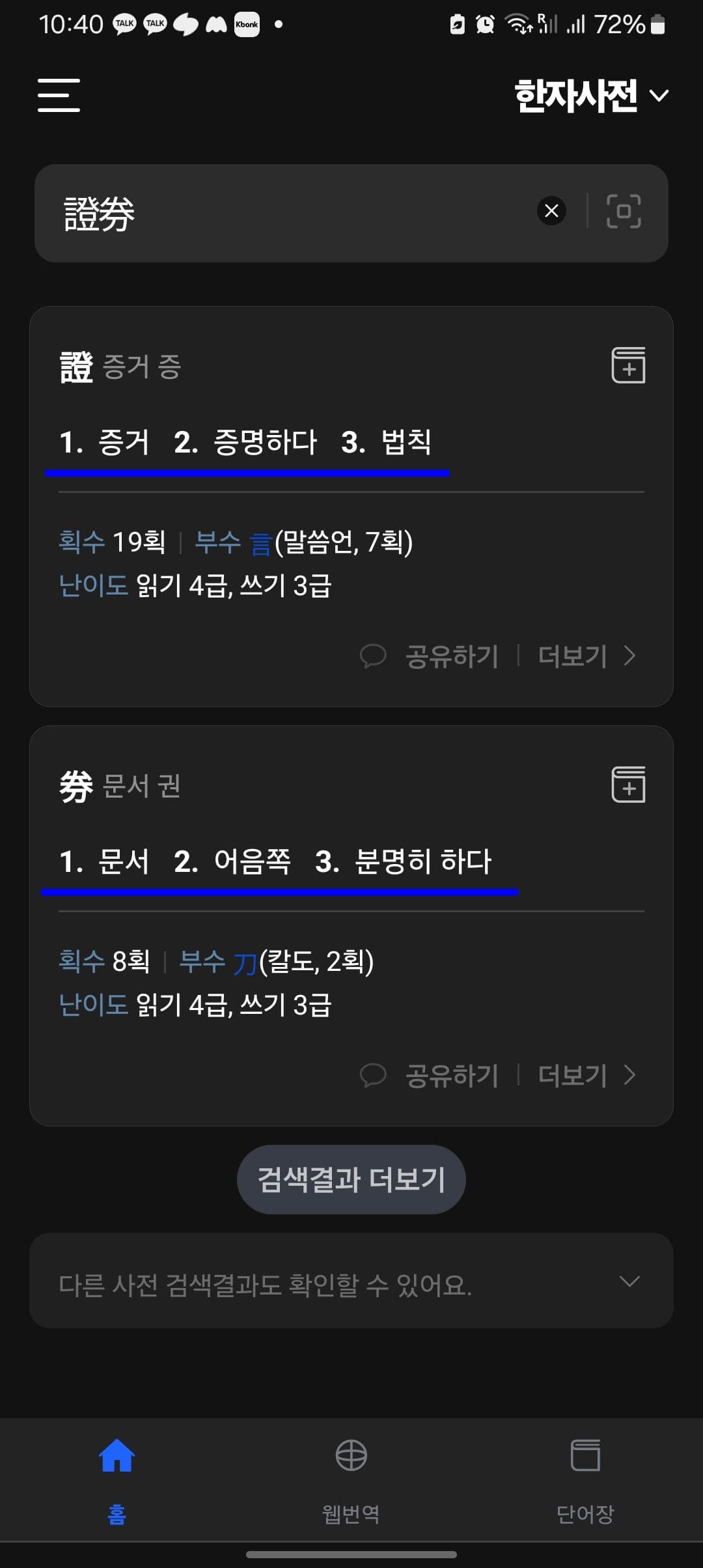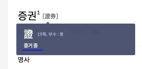 앱에서는 바로 증권에 사용된 한자가 ‘증거 증’, ‘문서 권’으로 조회되어 더 편리하다는 것을 알 수 있습니다.