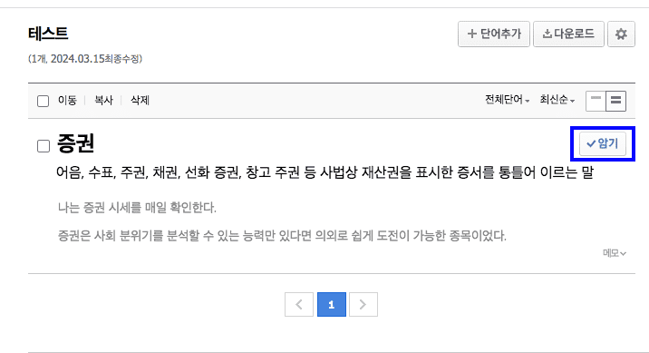 단어장 저장이 완료되었으면 상단 메뉴에서 단어장을 선택합니다. 저장된 단어는 미암기로 등록이 되어있지만 한번 더 클릭하면 암기로 변경할 수 있으니 한번 직접 확인해 보시기 바랍니다.