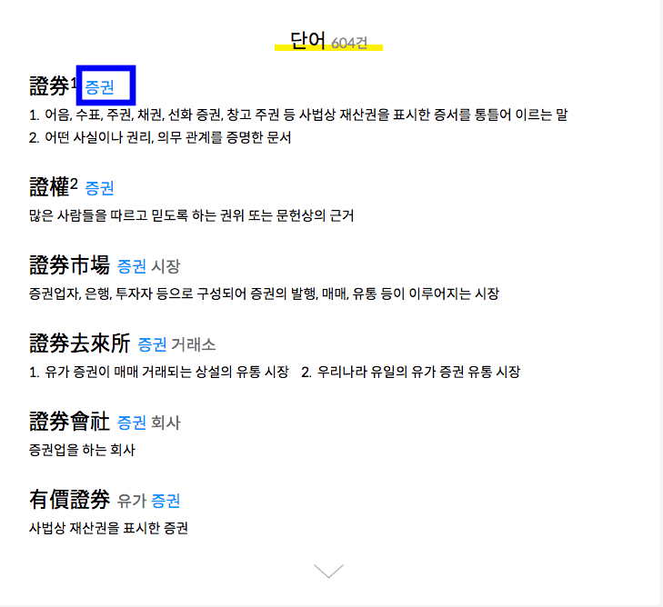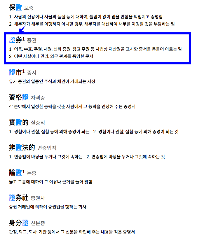 증권과 관련된 단어들이 표시되면 가장 상단에 제가 찾고자 했던 ‘증권’의 한자가 무엇인지 찾아보도록 하겠습니다. 표시된 [증권]을 클릭합니다.
