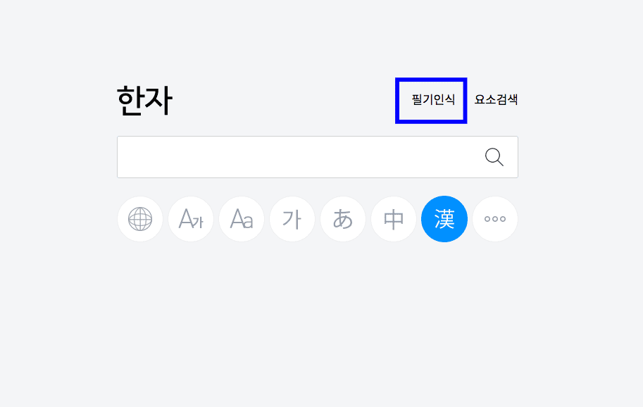 이제 제가 배운 한자가 필기 인식에서 제대로 인식이 되는지 확인해 보겠습니다. 다음 한자 사전 메인 화면으로 돌아가서 입력창 우측 상단의 [필기인식] 버튼을 클릭합니다. 한자 필기인식 영역이 표시되면 표시된 사각형 영역에 아까 찾은 한자인 ‘증거 증’을 마우스로 그려봅니다.