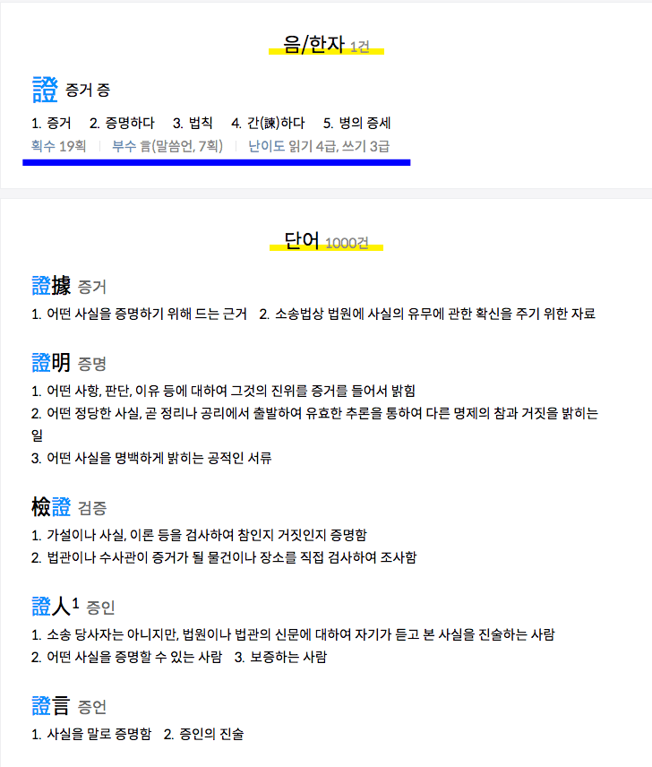 제가 직접 그린 한자가 증거 증으로 검색되었습니다. 뜻은 증거, 증명하다, 법칙, 간하다, 병의 증세로 획수는 19획 부수는 말씀언이라는 정확한 정보를 얻게 되었습니다. 하단을 보시면 해당 한자가 사용된 다양한 단어들도 확인이 가능합니다.
