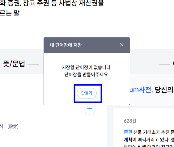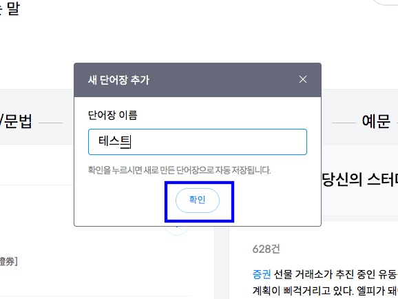 페이지가 이동되면 우측의 [바로저장] 버튼을 클릭합니다. 아직 단어장이 없다면 하단의 만들기를 선택합니다. 새 단어장 추가에 이름을 입력하고 하단의 확인 버튼을 클릭합니다.