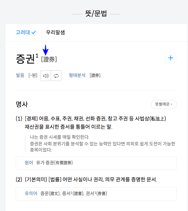 뜻/문법 영역에서 증권에 사용된 한자를 클릭합니다. ‘증거 증’과 ‘문서 권’이 사용되었다는 것을 확인할 수 있습니다.