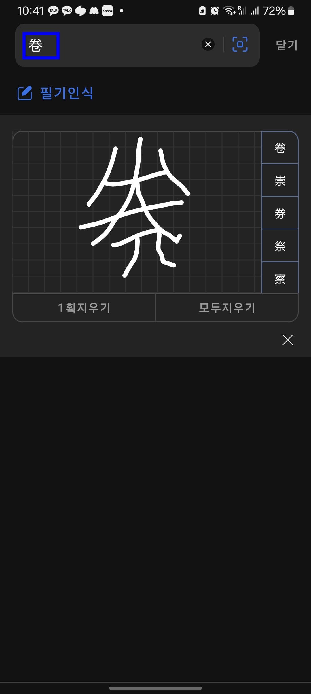 제가 그린 한자가 잘 못 그려졌는지 말권이라는 다른 한자가 나오고 말았습니다.^^ 이렇게 새로운 한자를 알게 될 수도 있습니다.