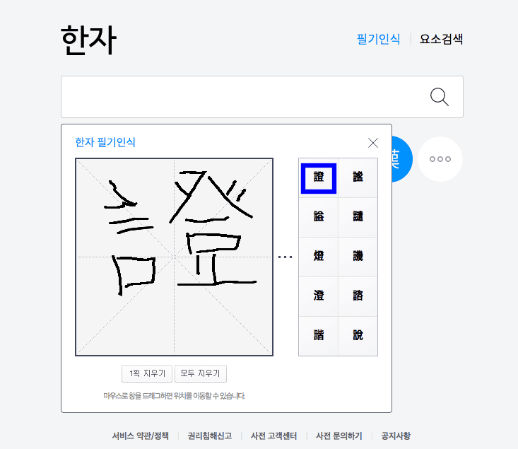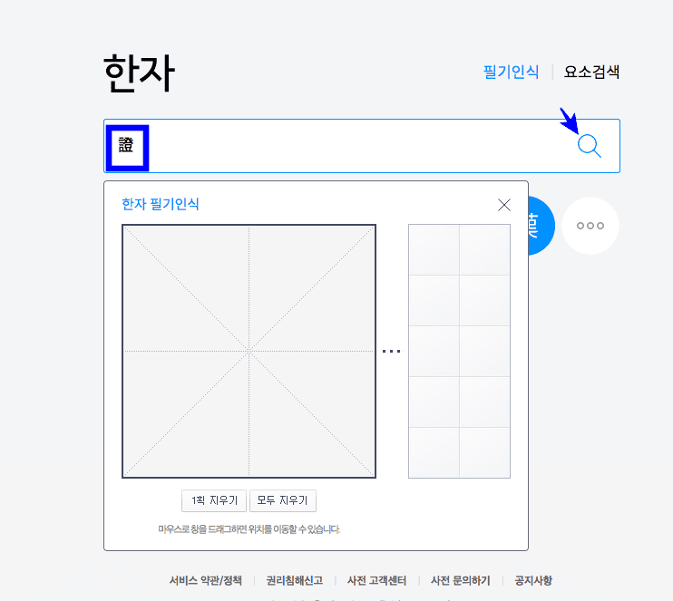 이제 제가 배운 한자가 필기 인식에서 제대로 인식이 되는지 확인해 보겠습니다. 다음 한자 사전 메인 화면으로 돌아가서 입력창 우측 상단의 [필기인식] 버튼을 클릭합니다. 한자 필기인식 영역이 표시되면 표시된 사각형 영역에 아까 찾은 한자인 ‘증거 증’을 마우스로 그려봅니다.