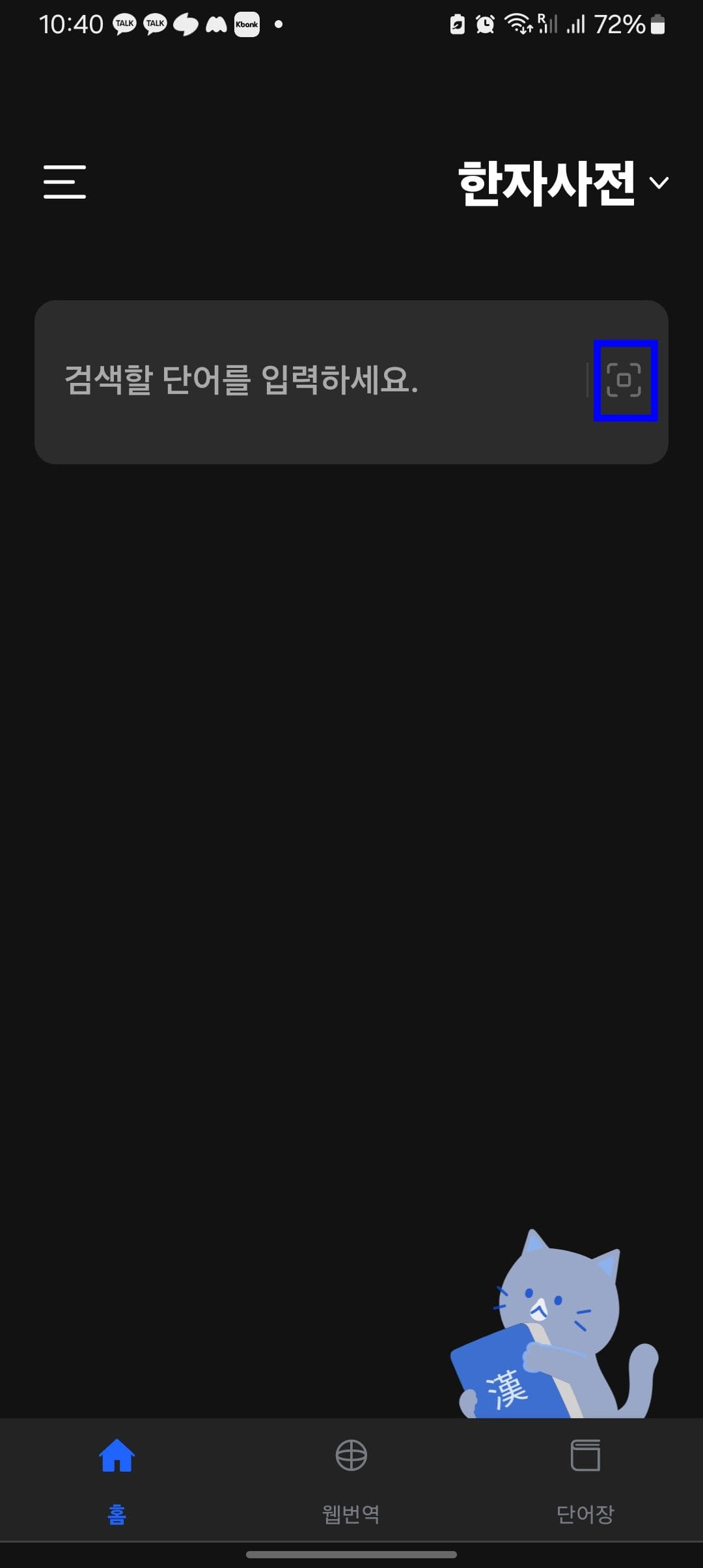 다음 한자 사전 앱을 실행하시면 처음에는 영어사전을 클릭하여 언어선택 화면이 표시되면 하단에서 한자를 선택합니다. 이번에도 증권이라는 단어를 검색해 보았습니다.