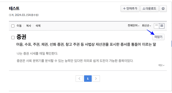 단어장 저장이 완료되었으면 상단 메뉴에서 단어장을 선택합니다. 저장된 단어는 미암기로 등록이 되어있지만 한번 더 클릭하면 암기로 변경할 수 있으니 한번 직접 확인해 보시기 바랍니다.