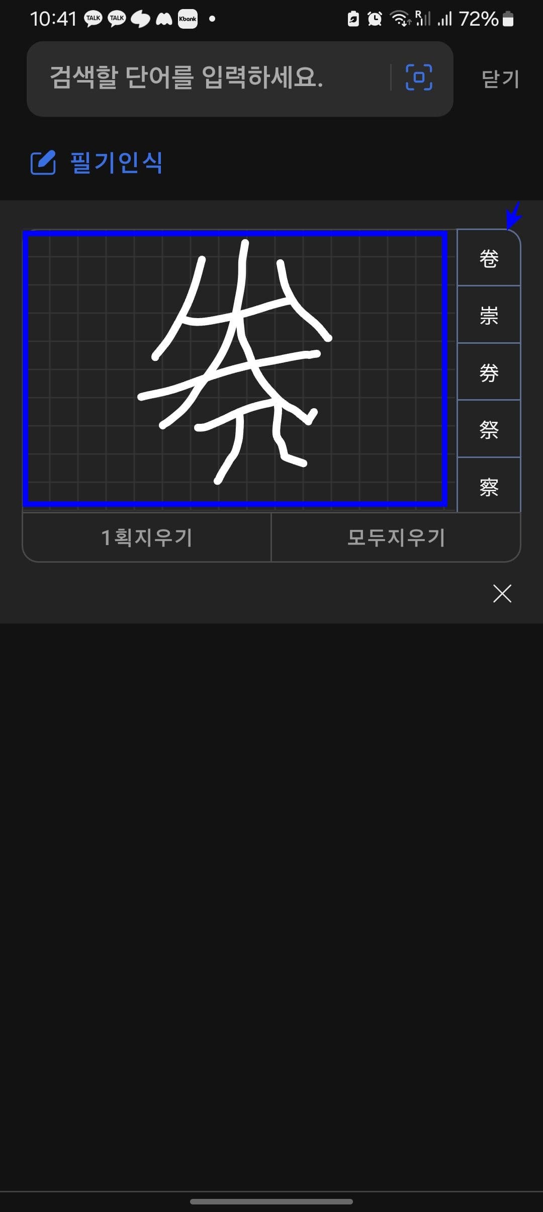 이번에도 필기인식 기능을 사용해 보도록 하겠습니다. 입력창 우측의 표시된 아이콘을 터치합니다. 필기인식 영역에 손가락으로 문서 권을 그리고 우측에 표시된 처음 한자를 터치합니다. 한자가 입력창에 입력되었다면 엔터키를 터치하여 검색합니다.