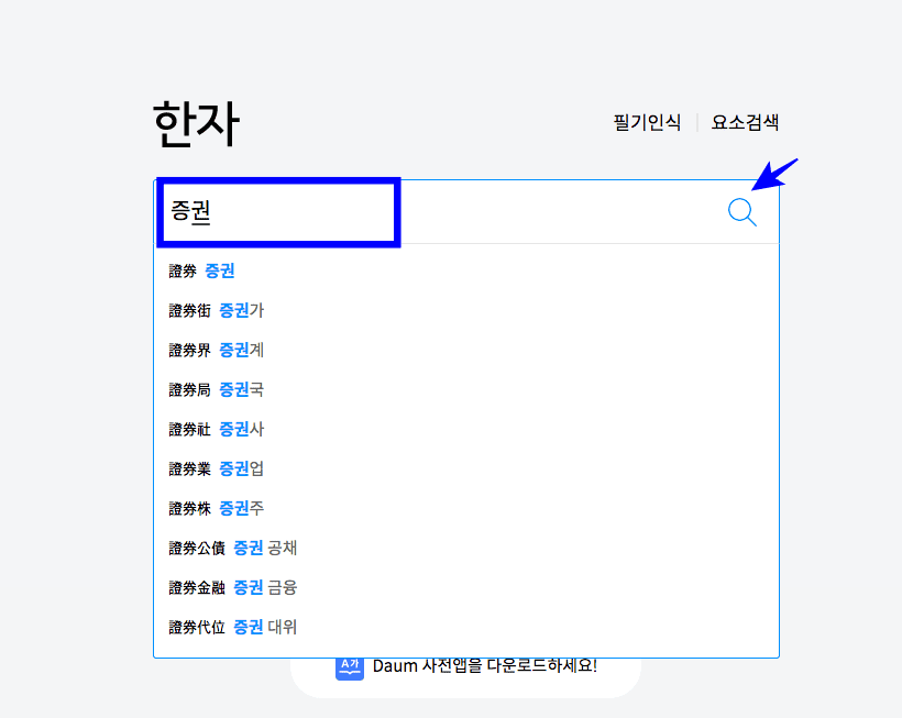다음 한자 사전 페이지로 이동하시면 위와 같은 메인 화면을 보게 됩니다. 먼저 마땅히 찾을 한자가 생각나지 않는다면 입력창에 평소 알고 싶었던 단어를 입력하고 검색합니다. 저는 ‘증권’이라는 단어를 찾아보도록 하겠습니다.