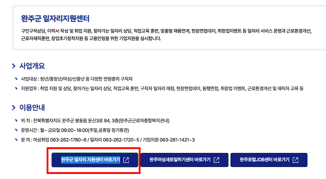일자리 페이지 좌측을 보시면 [일자리 지원센터 / 완주여성 새로 일하기 센터]라는 메뉴를 볼 수 있습니다. 페이지로 들어가시면 하단에서 [완주군 일자리 지원센터 바로가기]를 클릭합니다.