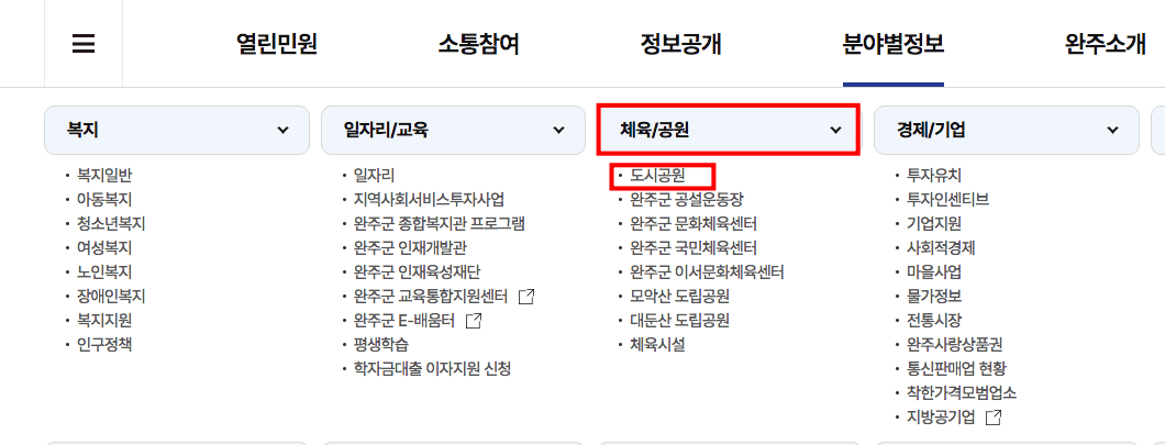 건강을 위한 체육 시설에 대한 정보도 홈페이지에서 확인이 가능합니다. 상단 메뉴 분야별 정보 > 체육공원 > 도시공원을 선택합니다.