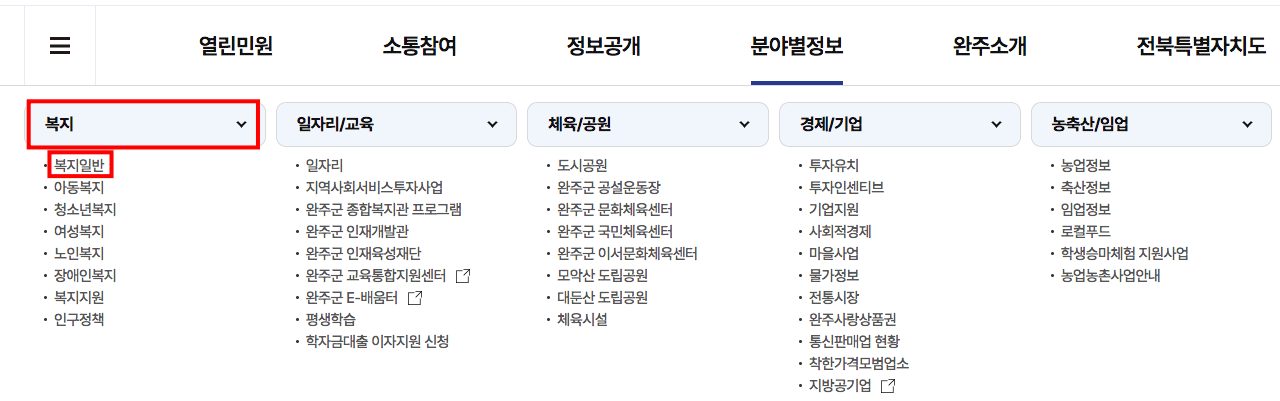 마찬가지로 완주군의 복지 정보를 확인하시려면 홈페이지 상단 분야별 정보 > 복지 > 일반복지 메뉴를 선택합니다. 완주군에서 제공하는 복지는 국민기초생활보장, 의료급여, 아동복지, 청소년복지, 여성복지, 노인복지, 장애인복지 등이 있으니 천천히 살펴보시기 바랍니다.