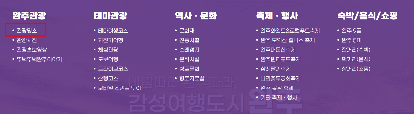 이곳에서는 관광명소, 테마여행코스, 자전거여행, 체험관광, 도보여행, 드라이브코스 등 다양한 관광정보 확인이 가능합니다. 완주관광 > 관광명소를 선택해 보겠습니다.