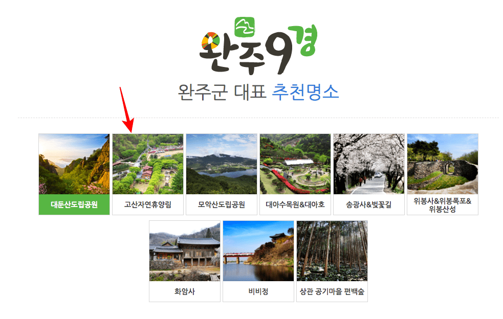 완주군 대표 추천명소는 완주 9 경이라고 합니다. 페이지에서 마음에 드는 명소를 선택합니다. 페이지 하단에서 해당 명소에 대한 사진과 자세한 설명을 확인할 수 있습니다.