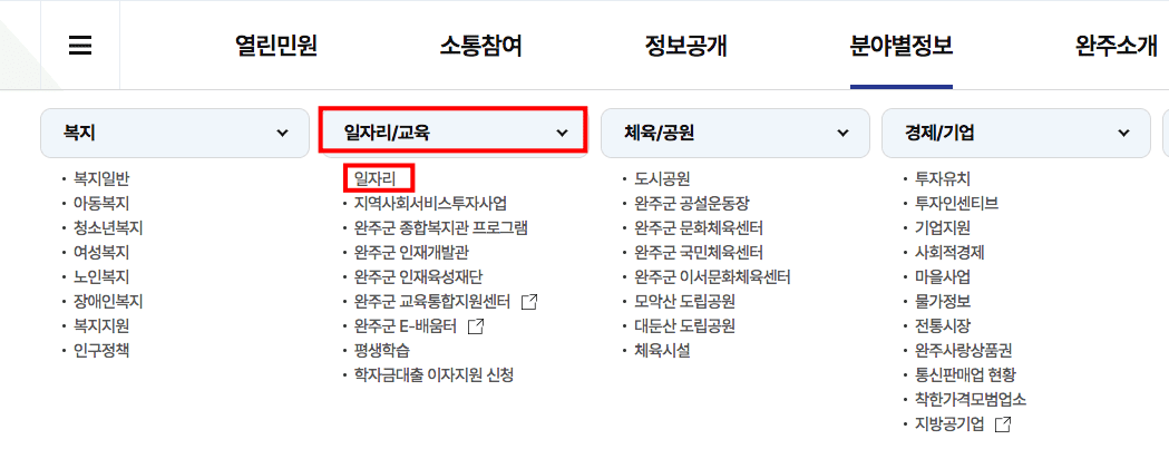완주군 홈페이지에 방문하시면 위와 같은 메인 화면을 확인할 수 있습니다. 상단 메뉴에서 [분야별 정보]로 마우스를 올려둡니다. 하단에 세부 메뉴가 보이면 일자리/교육 > 일자리 메뉴를 선택합니다.