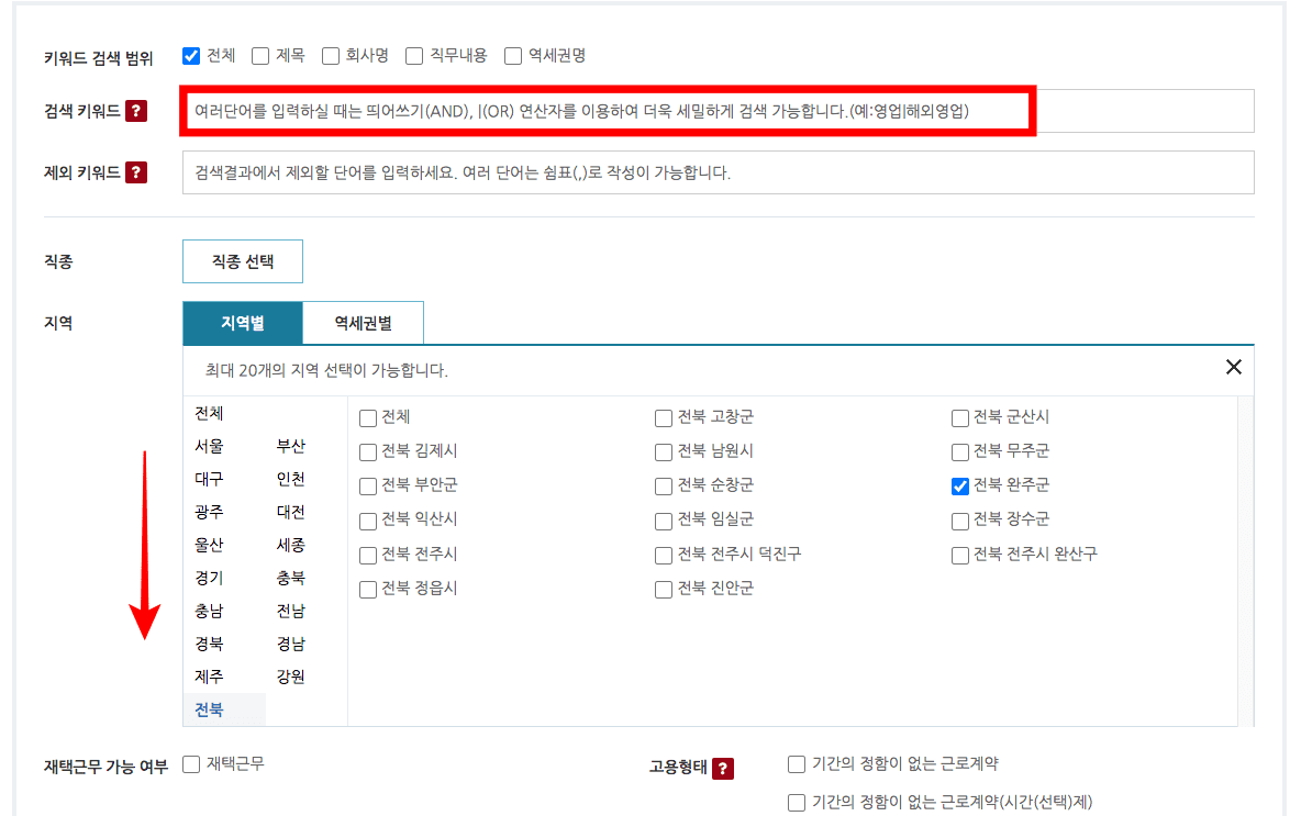 완주군일자리지원센터 페이지가 표시되면 상단 메뉴에서 채용정보 > 채용정보검색을 선택합니다. 검색 페이지가 표시되면 검색 키워드, 직종, 지역 등을 선택하고 스크롤을 내립니다.