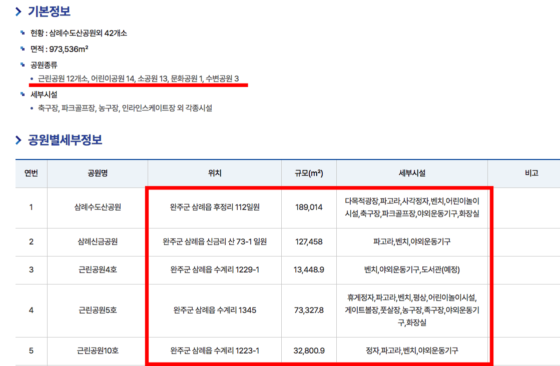 완주군에는 근린공원 12개소, 어린이공원 14개소, 소공원13개소 등이 있습니다. 하단의 공원별 세부정보를 확인하시면 각 공원의 위치와 규모, 세부시설을 확인할 수 있습니다. 야외운동기구가 있는 곳이라면 어디서든 운동을 할 수 있다는 점이 좋았습니다.