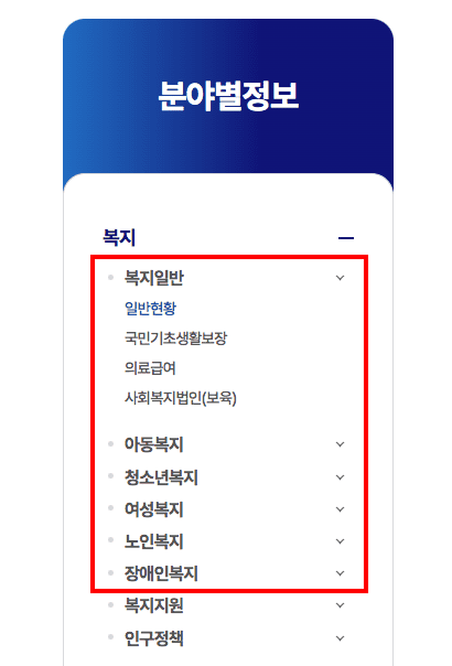 마찬가지로 완주군의 복지 정보를 확인하시려면 홈페이지 상단 분야별 정보 > 복지 > 일반복지 메뉴를 선택합니다. 완주군에서 제공하는 복지는 국민기초생활보장, 의료급여, 아동복지, 청소년복지, 여성복지, 노인복지, 장애인복지 등이 있으니 천천히 살펴보시기 바랍니다.