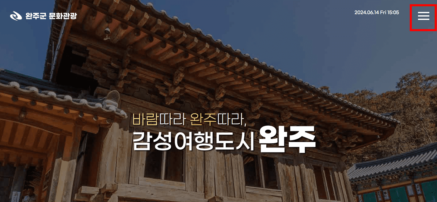 완주군 문화관광 홈페이지에 도착하시면 위와 같은 페이지를 보게 됩니다. 우측 상단의 삼선 아이콘을 선택합니다.