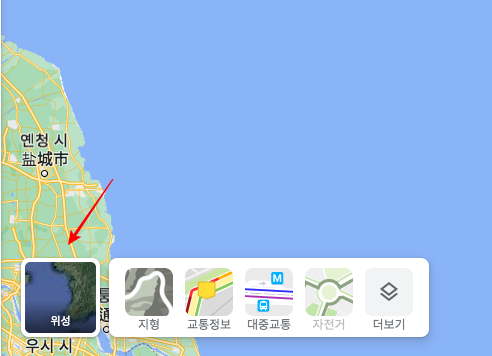 또한 지도의 좌측 하단에 레이어 메뉴를 선택해 봅니다. 이 메뉴는 위성사진으로 우리나라 지도를 보여 주며 세부 메뉴에서 지형, 교통정보, 대중교통, 자전거 등을 선택하여 원하시는 타입의 지도를 확인할 수 있습니다.