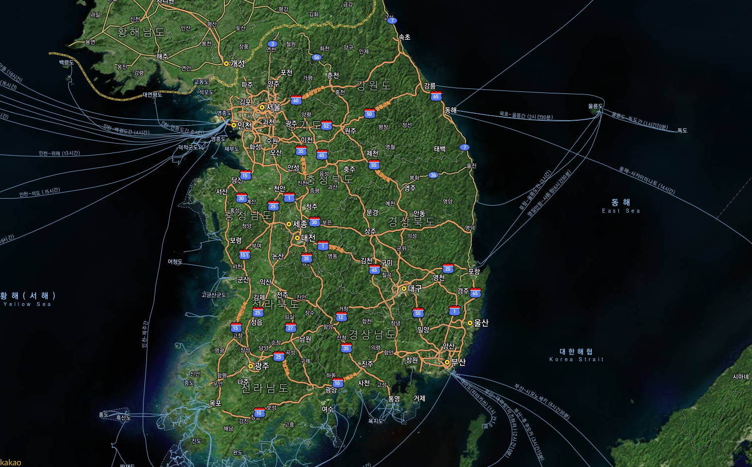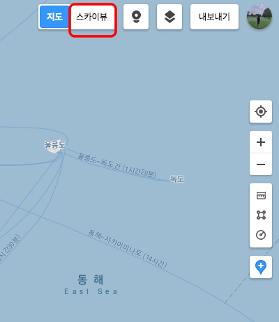 우측 상단에서 스카이뷰 메뉴를 클릭하시면 실제 위성사진으로 촬영된 우리나라 지도 크게보기가 가능합니다.